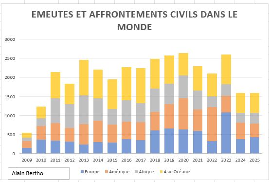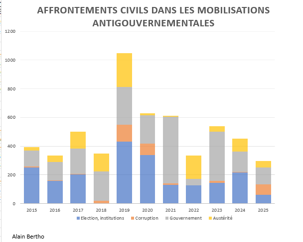 Cette salve de soulèvement en 2025 est assez paradoxale au regard de l’évolution générale marquée par la baisse globale des émeutes et affrontements civils, particulièrement visible sur le terrain des mobilisations les plus politiques après le pic de 2019, dans un contexte de répression de plus en plus brutale.