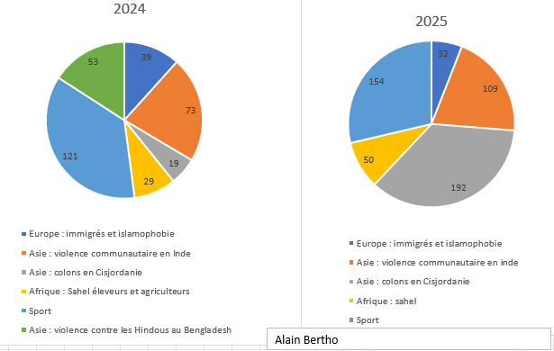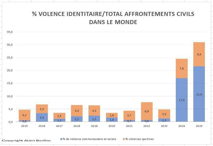 Sur plusieurs continents, la montée sans précédent de la violence identitaire observée en 2024 est largement confirmée en 2025. Elle est accompagnée d’une montée de la violence autour des stades qui, pour être d’une intensité bien moindre, n’en ressort pas moins de la même volonté d’en découdre avec un « autre » que la situation peut constituer en ennemi.