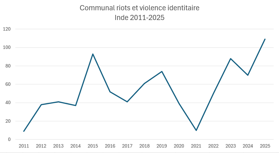 Les affrontements communautaires et religieux sont structurels dans la société indienne et particulièrement dirigés contre les musulmans depuis l’arrivée au pouvoir de Narendra Modi en 2014. L’affirmation d’une identité indienne hindou et islamophobe a culminé en 2019-2020 avec le Citizenship Amendement Act6 qui a généré une mobilisation massive et violente notamment en Assam et dans les États du Nord. À cette islamophobie d’État s’ajoute depuis le printemps 2023, un conflit communautaire singulier dans l’État du Manipur entre les Meilei hindous, majoritaires et dominants, et les Kuki Zo chrétiens. Enfin, les « communal riots » peuvent être tout simplement sociales dans un pays de castes où les Dalits sont l’objet d’une domination discriminatoire. Les affrontements communautaires ont chuté provisoirement en 2021, année des grandes mobilisations contre le dérégulation des marchés agricoles.
