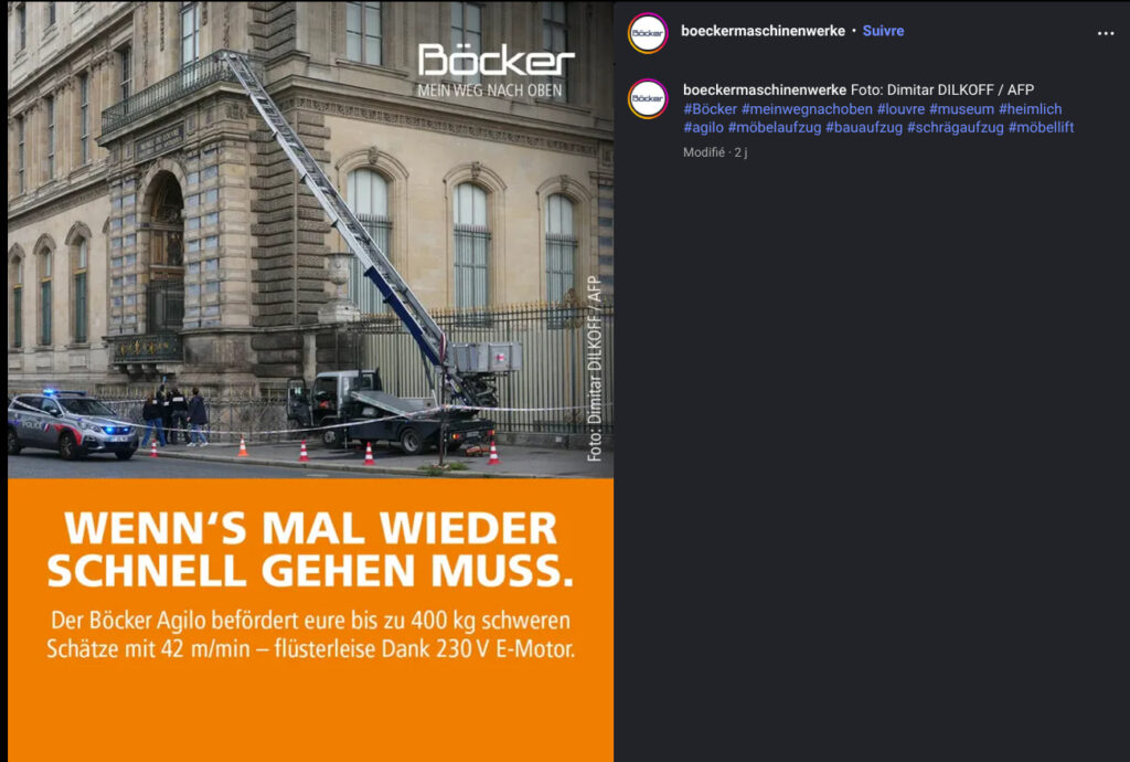 Böcker, l’entreprise allemande qui a produit le monte-charge utilisé pour le cambriolage du Louvre, fait sa publicité sur les réseaux sociaux avec ce message : « Quand il faut faire vite ».