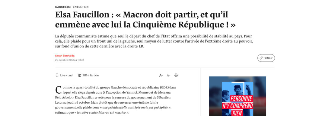 « Macron doit partir, et qu’il emmène avec lui la Cinquième République ! » Une interview d’Elsa Faucillon sur Mediapart. La députée communiste propose une « présidentielle anticipée mais pas précipitée » pour sortir de la crise politique, estimant qu’Emmanuel Macron en est le premier comptable. Budget Lecornu, division de la gauche sur la censure et perdition des LR vers le RN, Elsa Faucillon pose le diagnostic d’une République en faillite. Mais pour fonder la Sixième, « reste-t-il suffisamment de républicains à droite » ?