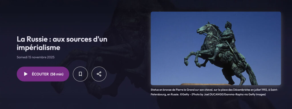 « La Russie : aux sources d’un impérialisme », sur France Culture. Un podcast qui nous amène, du tsarisme à Poutine en passant par Lénine et son « union des républiques », à voir la formation d’une nation sur plusieurs siècles, la construction d’une identité et les tensions entre expansion géographique et impérialisme. Une émission avec Sabine Dullin, historienne de la Russie, qui donne à réfléchir sur les politiques poutiniennes.