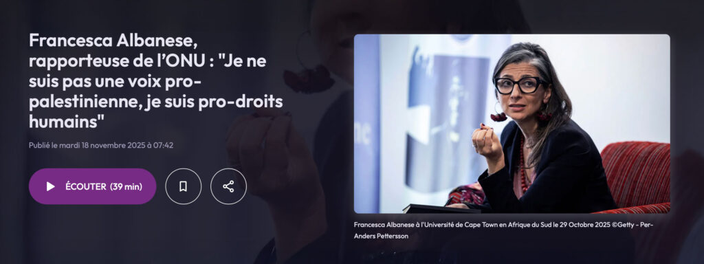 L’entretien avec Francesca Albanese, rapporteuse spéciale de l’ONU sur les droits humains dans les territoires palestiniens occupés, sur France Culture. La force de cette femme combative et brillante venue pour parler d’un génocide, d’un peuple meurtri et d’un État en perdition : se placer du côté du droit international, résolument, obstinément et magistralement.