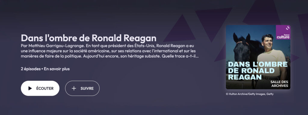 « Dans l’ombre de Ronald Reagan », sur France Culture. Ou comment nous rendre nostalgique (lol) du fondateur du néolibéralisme avec sa copine Margareth Thatcher. Reste que Reagan apparaît comme un homme sympathique… pas comme son successeur actuellement au pouvoir, lui aussi homme de spectacle !