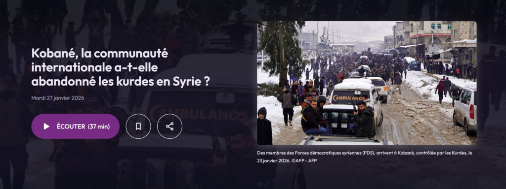 Kobané, la communauté internationale a-t-elle abandonné les Kurdes en Syrie ?, une discussion dans l’émission Questions du soir sur France Culture. Dans le fracas actuel du monde, on n’en parle hélas assez peu : pourtant, alors que les Kurdes avaient signé en mars 2025 un accord avec le nouveau pouvoir syrien, l’armée syrienne mène actuellement une offensive dans tout le nord-est pour reprendre le contrôle du territoire. Pour tout comprendre des enjeux, des revirements d’alliances et surtout de la Syrie du nouveau président Ahmed al-Charaa et de son projet de république islamiste.