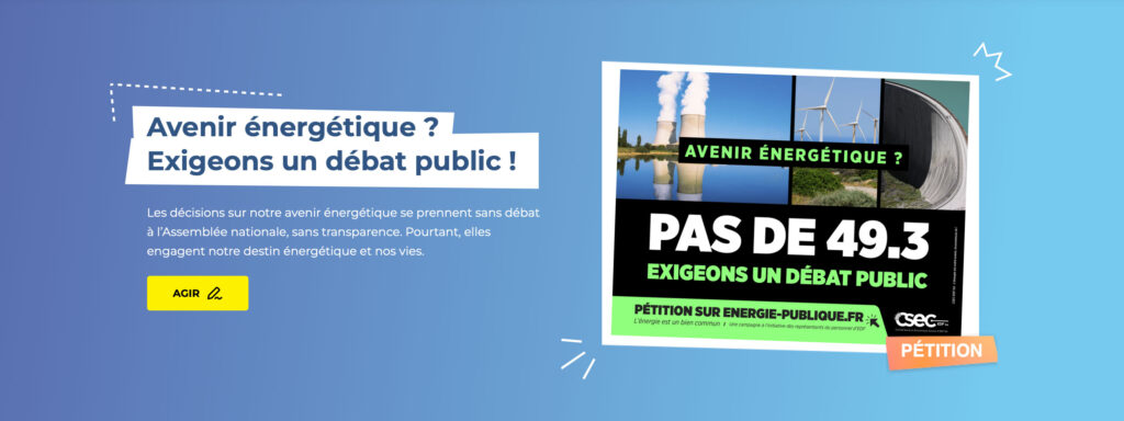 Les Comités Sociaux et Économiques Centraux d’EDF et d’Enedis lancent une pétition pour obtenir un débat et un vote au Parlement sur la Programmation pluriannuelle de l’énergie, qui fixe la trajectoire de notre consommation et de nos investissements énergétiques pour les dix prochaines années. Alors que le gouvernement envisagerait un 49.3, les représentants des salariés déplacent la bataille du terrain syndical vers les citoyens : leur appel, ouvert à tous, s’affiche désormais sur les abribus, dans l’espace public. Une manière de rappeler que ce patrimoine industriel est un bien commun. Et que sa défense se joue désormais à l’échelle du pays.