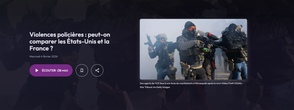 « Violences policières : peut-on comparer les États-Unis et la France ? », sur France Culture. La ville de Minneapolis vient d’être le théâtre de deux bavures, des agents de la ICE tuant froidement Renee Nicole Good et Alexis Pretti. En France, une nouvelle fois, un homme, El Hacen Diarra, est mort dans un commissariat. D’un côté de l’Atlantique, les bavures ont été suivies d’une mobilisation populaire spectaculaire, de l’autre, rien. Pourquoi ? Fabien Jobard, directeur de recherches au CNRS, Yann Philippe, maître de conférences en histoire et civilisation américaines et Frédérique Sandretto, américaniste, s’interrogent sur les différences et similitudes entre les polices américaines et françaises, leurs approches plus ou moins démocratiques, le caractère systémique de la violence armée aux États-Unis (autant d’armes que d’habitants et l’un des taux d’homicides les plus élevés des pays du Nord).